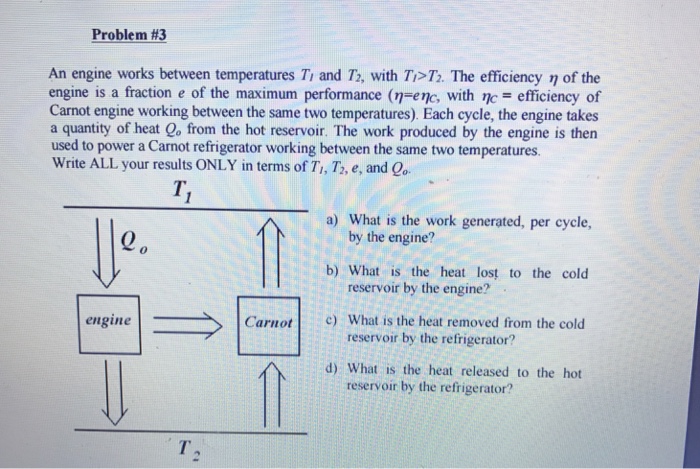 Exam 4. A heat engine operating at maximum efficiency has an efficiency of 35.0%. The temperature of the hot reservoir is 700 K. What is the temperature of the cold reservoir? ... Get Document